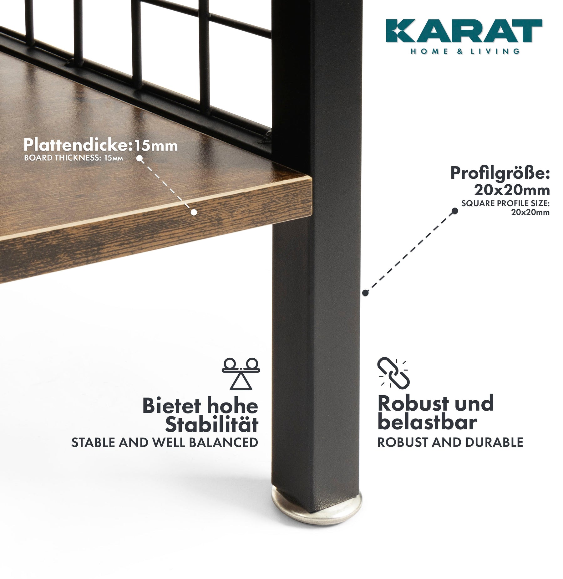 .Vores "Atlanta"-hylde - dette navn står for en stå- og opbevaringshylde, der viser sig at være en sand allrounder med hensyn til opbevaring i køkkenet, stuen eller entreen. Den er lavet af fiberplader med medium densitet (med melaminharpiksbelægning) og robust, pulverlakeret stål og gør en god figur i ethvert rum. Takket være det robuste bagpanel i træ og gittersiderne bliver opbevarede ting som køkkenredskaber, håndklæder, bøger osv. altid på plads. Funktionalitet møder stilfuldt, tidløst design. Hvad mere kan du ønske dig?