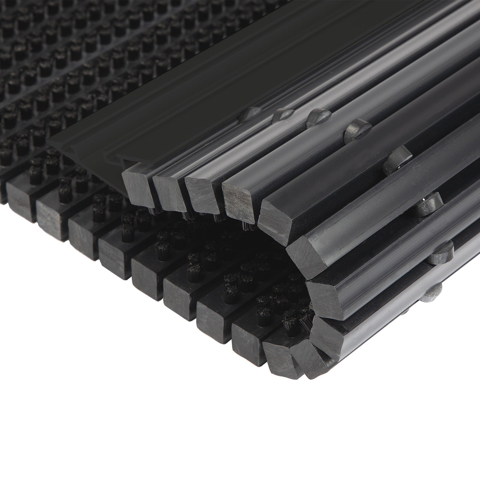 Rækkerne af børster er arrangeret i en førsteklasses sort ramme lavet af robust PVC. Takket være den tunge vægt og gummiknopperne på undersiden bliver dørmåtten altid på plads og glider ikke, selv ved hyppig brug. Materialet af høj kvalitet modstår ikke kun tunge mekaniske belastninger, men også vejret. Så dørmåtten kan bruges indendørs såvel som udendørs, i private såvel som kommercielle områder.